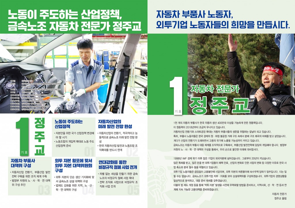 [선거홍보물 3차] 기호 1번 정주교 - 자동차 부품사 노동자, 외투기업 노동자들의 희망을 만듭시다